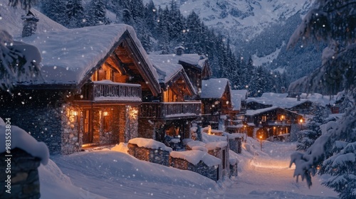 Fototapeta premium A cozy chalet in the French Alps, with snow-covered rooftops and a crackling...