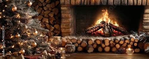 © Jiraporn, Fototapeta premium A cozy Christmas setting featuring a beautifully decorated tree by a warm fireplace, perfect for holiday ambiance.
