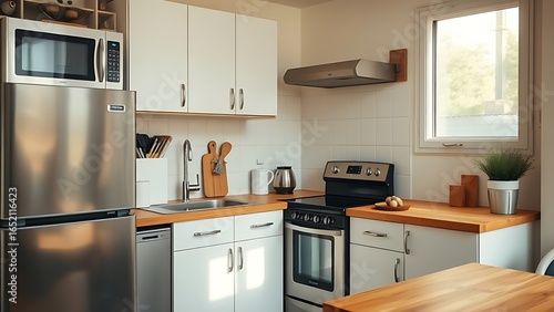 © YANG, Fototapeta premium A cozy compact kitchen featuring stainless steel appliances and a warm wooden countertop in natural light.