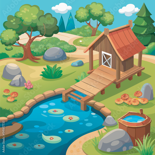 © Tahmina, Fototapeta premium A cozy cottage by a pond in a lush green landscape.