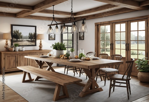 Obraz premium A cozy dining room featuring a large wooden table with matching benches and...