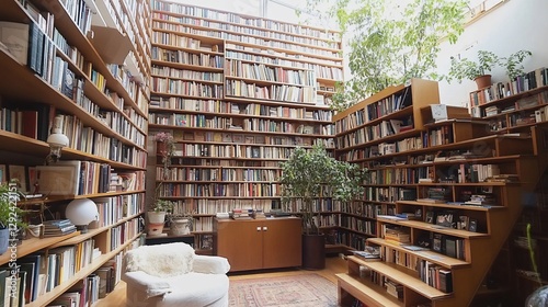 Obraz premium A Cozy Home Library with Floor to Ceiling Bookshelves and Natural Light