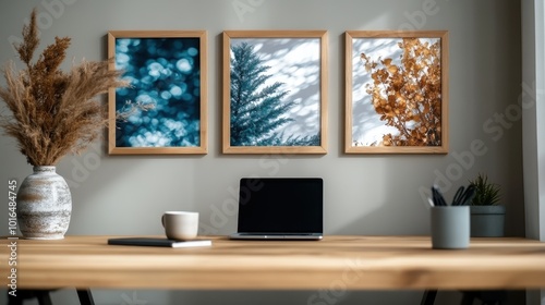 Obraz premium A cozy home office setup featuring a wooden desk, laptop, and three framed nature photos above, showcasing different seasonal foliage in a minimalist design.