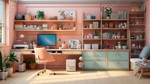 Fototapeta premium A cozy home office with a large desk, a comfortable chair, and plenty of storage space