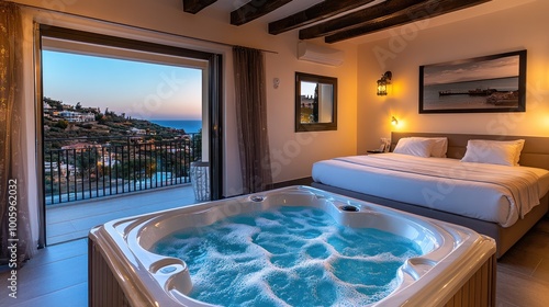 © BerkahStock, Obraz premium A cozy hotel room featuring a hot tub and scenic view at sunset.