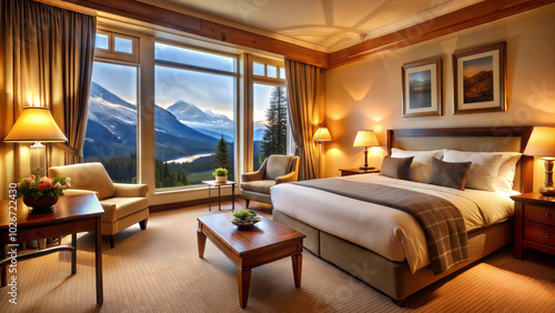 © Konstantin, Naklejka premium A cozy hotel room with a large bed and a panoramic window overlooking the mountains.