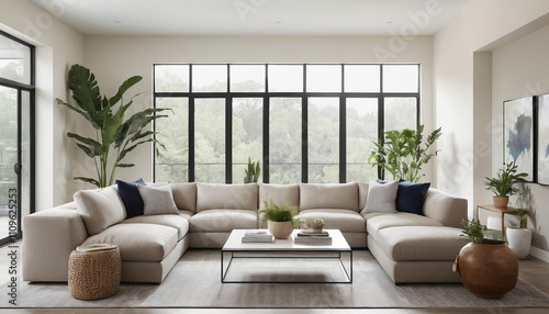 Fototapeta premium A Cozy Living Room with a Cream Sectional Sofa and Large Windows