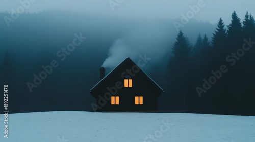 © Aleksandra, Fototapeta premium A cozy log cabin in the woods in winter with smoke coming from the chimney.