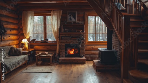 Naklejka premium A cozy log cabin interior with a burning fireplace and staircase