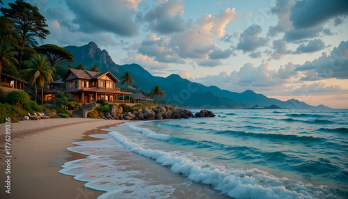 © Perecciv, Obraz premium A cozy lounge area with a sofa and coffee table on the seashore, a resort villa on the oceanfront, stylish interior.