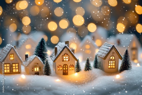 Fototapeta premium A cozy miniature winter village scene with small snow-covered houses, pine trees, and festive