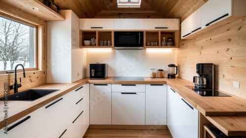 Fototapeta premium A cozy, modern kitchen with wood finishes, stainless appliances, and ample light from two windows. Sleek, minimalist design with efficient use of space.