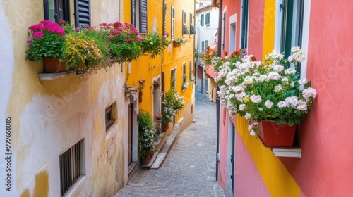 Fototapeta premium A cozy, narrow alley in a village, with colorful houses, flower boxes, and...