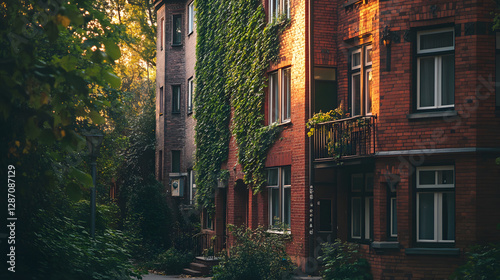 Fototapeta premium A cozy old brick apartment building with ivy climbing up the facade nestled...