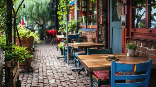 © Chandara, Obraz premium A cozy outdoor cafe with wooden tables and chairs, green and red plants, and a brick path leading to a door with a red frame.