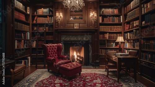 © Bipul Kumar, Obraz premium A Cozy Reading Nook with a Fireplace and a Red Chair Generative AI