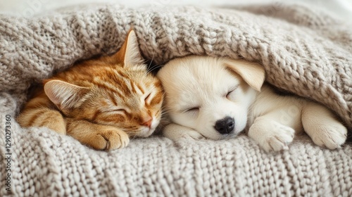 © DREAMERLYN STUDIO, Fototapeta premium A cozy scene of a kitten and a puppy napping together under a warm blanket