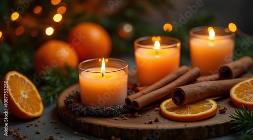 Obraz premium A cozy scene with lit candles, cinnamon sticks, and sliced oranges on a...