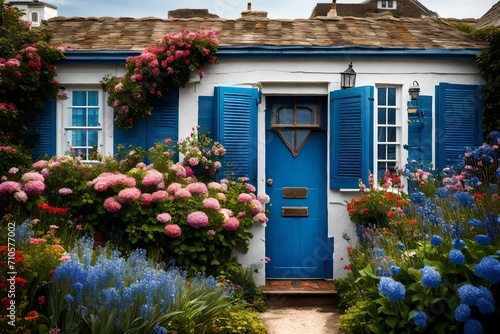 Obraz premium A cozy seaside home with a blue door and shuttered windows, nestled amidst a garden of vibrant blooms and offering glimpses of the sea beyond.