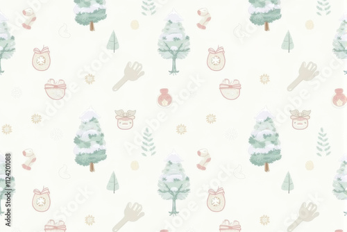 Fototapeta premium A cozy snow-themed Christmas pattern showcasing intricate snowflakes, soft winter tones, and snowy trees for a warm, festive design..
