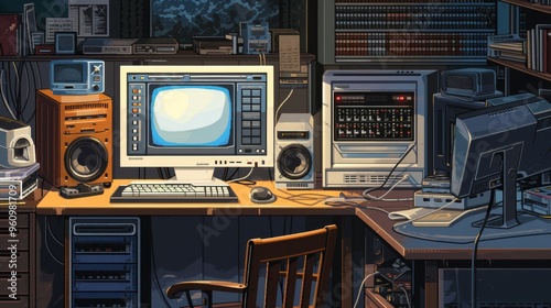 Obraz premium A cozy, vintage-inspired workstation featuring a retro computer, audio equipment, and various electronic devices. The setup is warmly lit, evoking a sense of nostalgia and technological history.