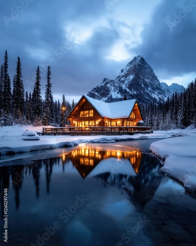 © Lakkhana, Fototapeta premium A cozy winter cabin glowing warmly amidst a snowy pine forest at twilight,