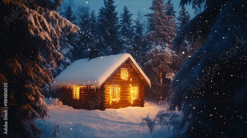 © Botboy, Fototapeta premium A cozy winter cabin in the middle of a winter wonderland, snow covering the roof and golden lights glowing inside.