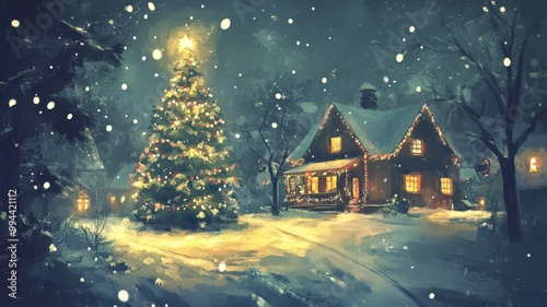 © Amanda, Fototapeta premium A cozy winter evening with a beautifully decorated Christmas tree outside a charming house under falling snowflakes
