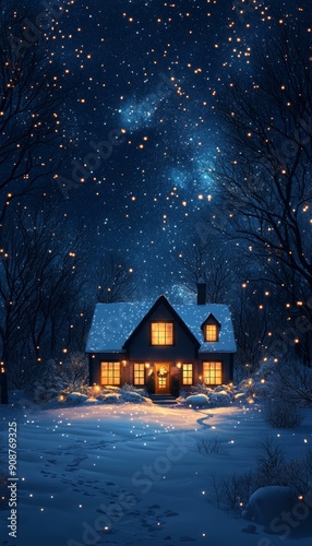 Fototapeta premium A cozy winter scene featuring a warmly lit house amidst falling snow,...
