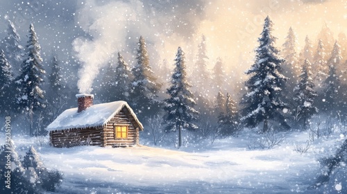 Naklejka premium A cozy winter scene of a rustic cabin nestled in a snowy forest, with smoke...