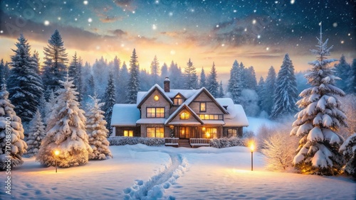 © Collection, Fototapeta premium A Cozy Winter Wonderland Snow-Covered House Illuminated at Dusk Surrounded by Majestic Evergreens