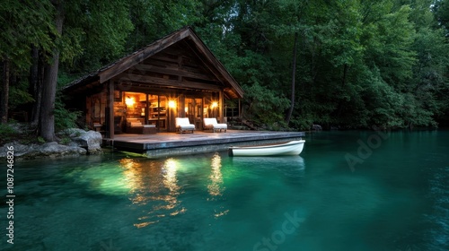 Fototapeta premium A cozy wooden cabin by a tranquil forest lake with glowing interior lights,...