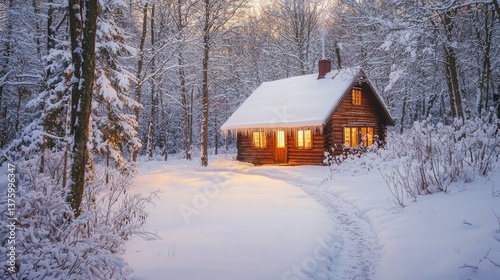 Naklejka premium A cozy wooden cabin covered in a thick layer of snow, nestled in a quiet...