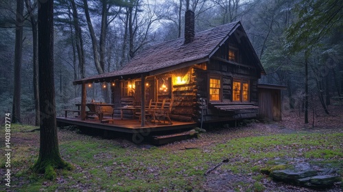 © Mnur, Obraz premium A Cozy Wooden Cabin Nestled Deep Within A Beautiful Forest Setting