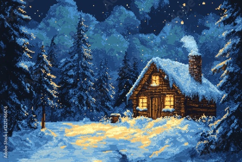 Naklejka premium A cozy wooden house nestled in a snowy landscape brings a sense of warmth, captured beautifully in pixel art style under a starry night sky.