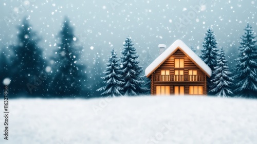 Naklejka premium A cozy wooden house stands amidst a snowy landscape, surrounded by tall evergreen trees, evoking a peaceful winter scene. The soft glow from the windows adds warmth to the chilly atmosphere.