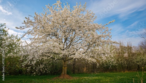 Naklejka premium A crabapple tree adorned with vibrant white blossoms during springtime,...