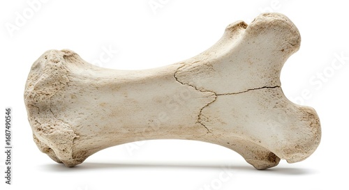 © PatriciaArt, Fototapeta premium A cracked bone with knobby ends lies horizontally against a white background casting a slight shadow