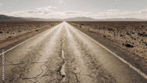 Naklejka premium A cracked desert road stretches to distant mountains under a cloudy sky, a...