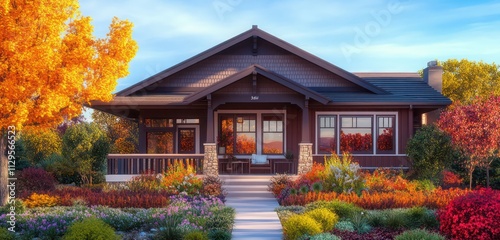 © Faisal Ai, Fototapeta premium A Craftsman home with an inviting porch, surrounded by colorful flowering plants and small trees that give the house a warm and welcoming feel