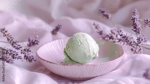 Fototapeta premium 40. A creamy pistachio ice cream scoop resting on a pastel lavender dish