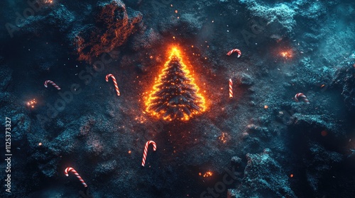 © Pannin, Fototapeta premium A creative Christmas loading design featuring a glowing tree icon and candy canes on a dark atmospheric backdrop.