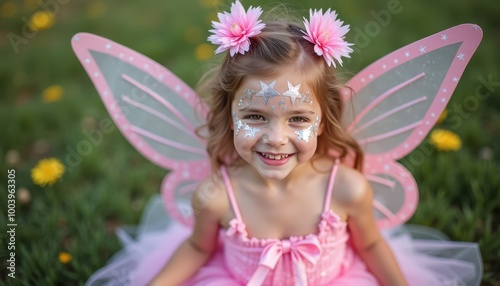 Fototapeta premium A creative DIY fairy costume with homemade wings a tutu made of tulle and glittery face paint with stars and sparkles.