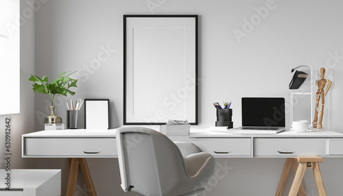 Fototapeta premium A creative workspace featuring a desktop computer and a white work table with an empty poster frame