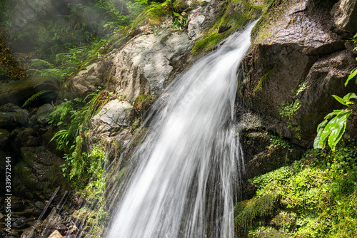 © Dmitrii Potashkin, Obraz premium A creek in a green forest with a waterfall, shot with a long exposure.