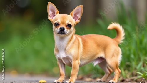 © ArtPro, Obraz premium A creel chihuahua stands alert on a path with a blurred green background.
