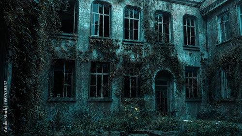Fototapeta premium A creepy abandoned asylum with broken windows and overgrown vines, designed...