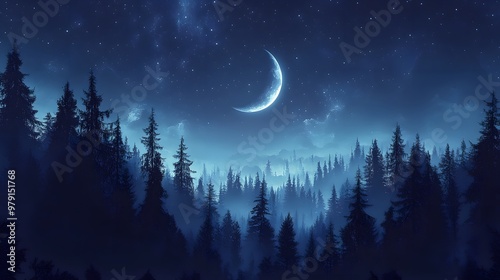 © Almultazam, Naklejka premium A Crescent Moon Illuminates a Foggy Forest Under a Starry Sky.