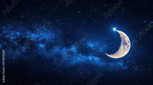 Fototapeta premium A crescent moon shines brightly against a backdrop of a star-filled night...