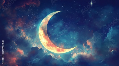 Fototapeta premium A crescent moon with a soft, glowing star, symbolizing guided meditation and...